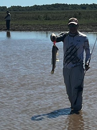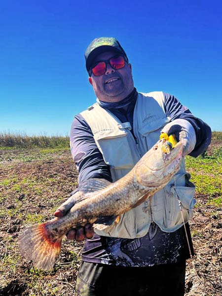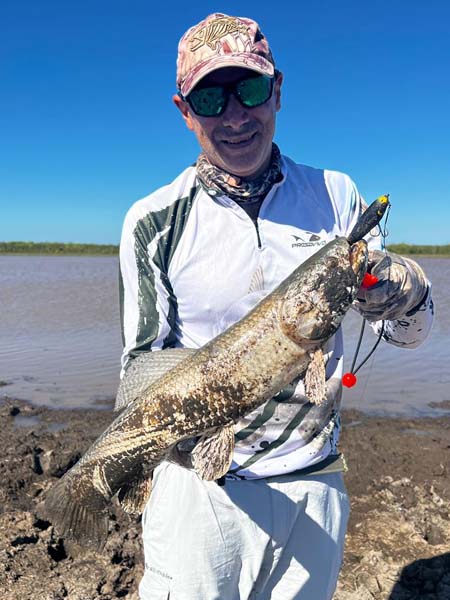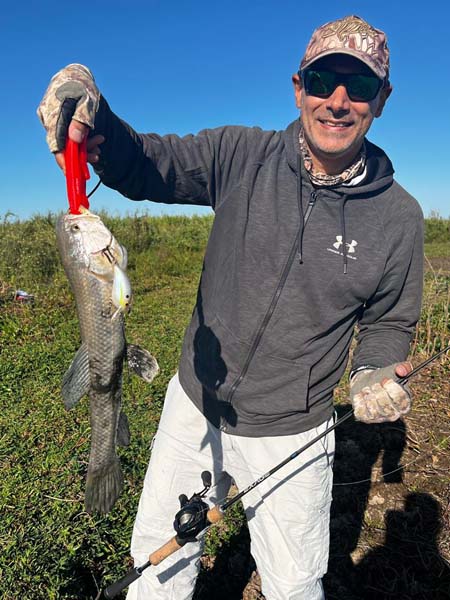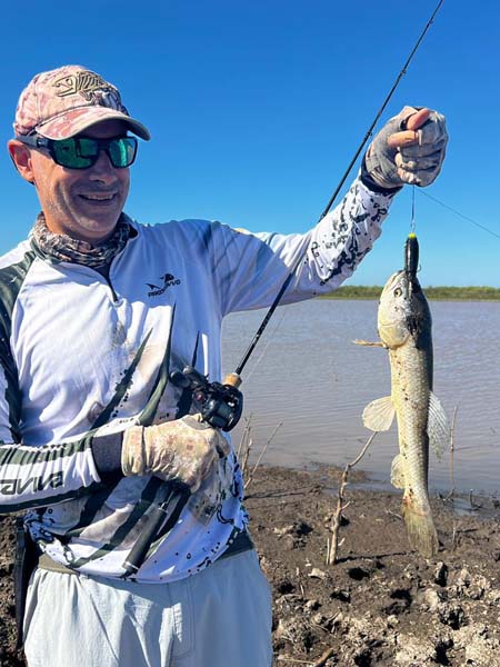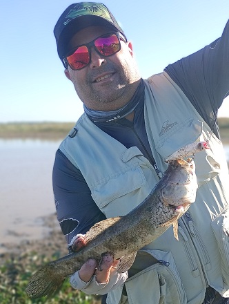 Nos metimos unos metros dentro del charco hasta la costita y comenzamos los lances, principalmente con señuelos duros. Yo empecé bajando un poquito probando con el Brava 77 de MS y Dami arrancó con algun crankito arriba que lo complicó en la clavada.