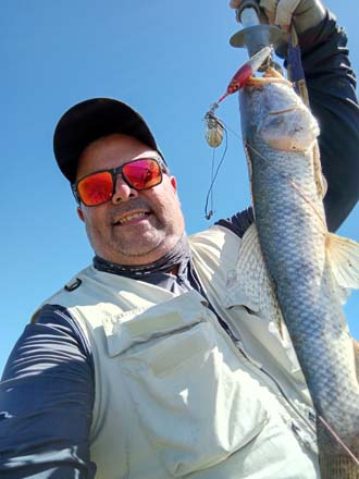 La descición fue la mejor que podríamos haber tomado. No solo el pique seguía firme sino que, de a ratos, se volvía rabioso, con ataques en cada lance. La única diferencia fue que al aumentar un poquito el viento nos obligó a buscarlas un poco mas abajo de la superficie. Ahi fue cuando apareció el arma letal final del día, el spinfish de Alfers.